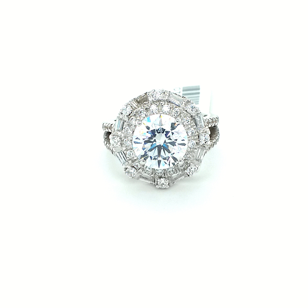 Pave-set halo CZ center stones on an 18 karat gold ring.