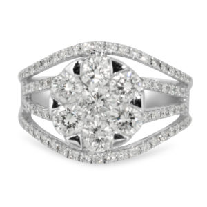 Pave setting diverging fingers cubic zirconia stones on an 18 gold engagement ring.