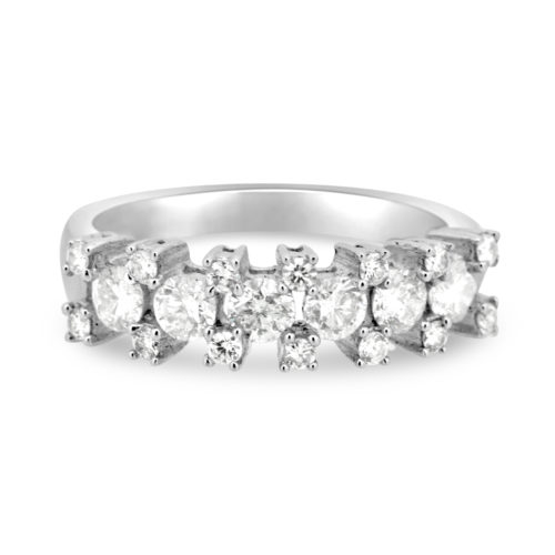 Tension centered on a channel setting of cubic zirconia stones on an 18 karat gold ring.