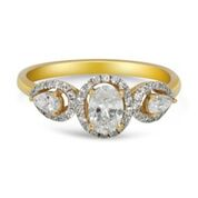 Princesss cut cathedral design with cubic zirconia stones on an 18 karat gold ring.