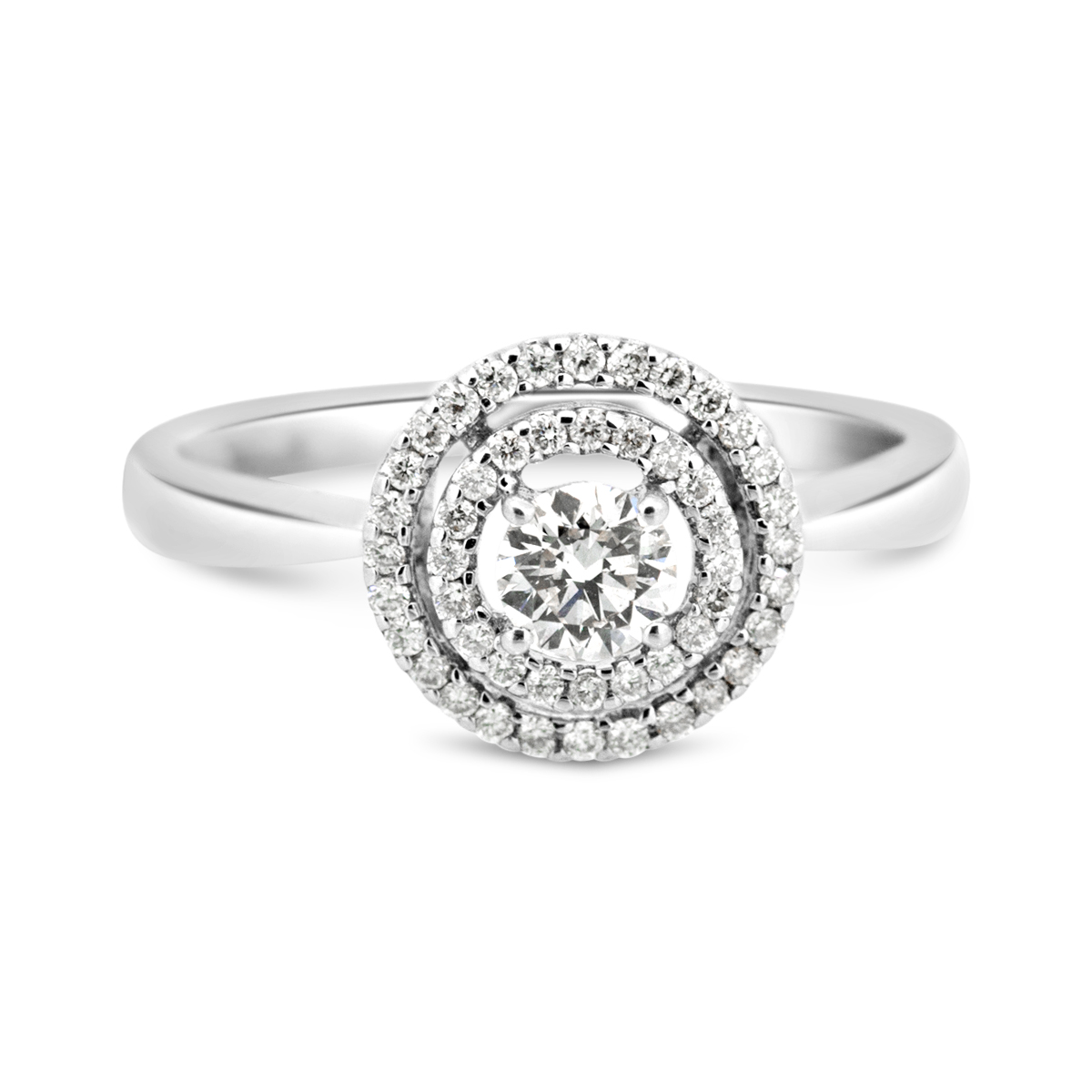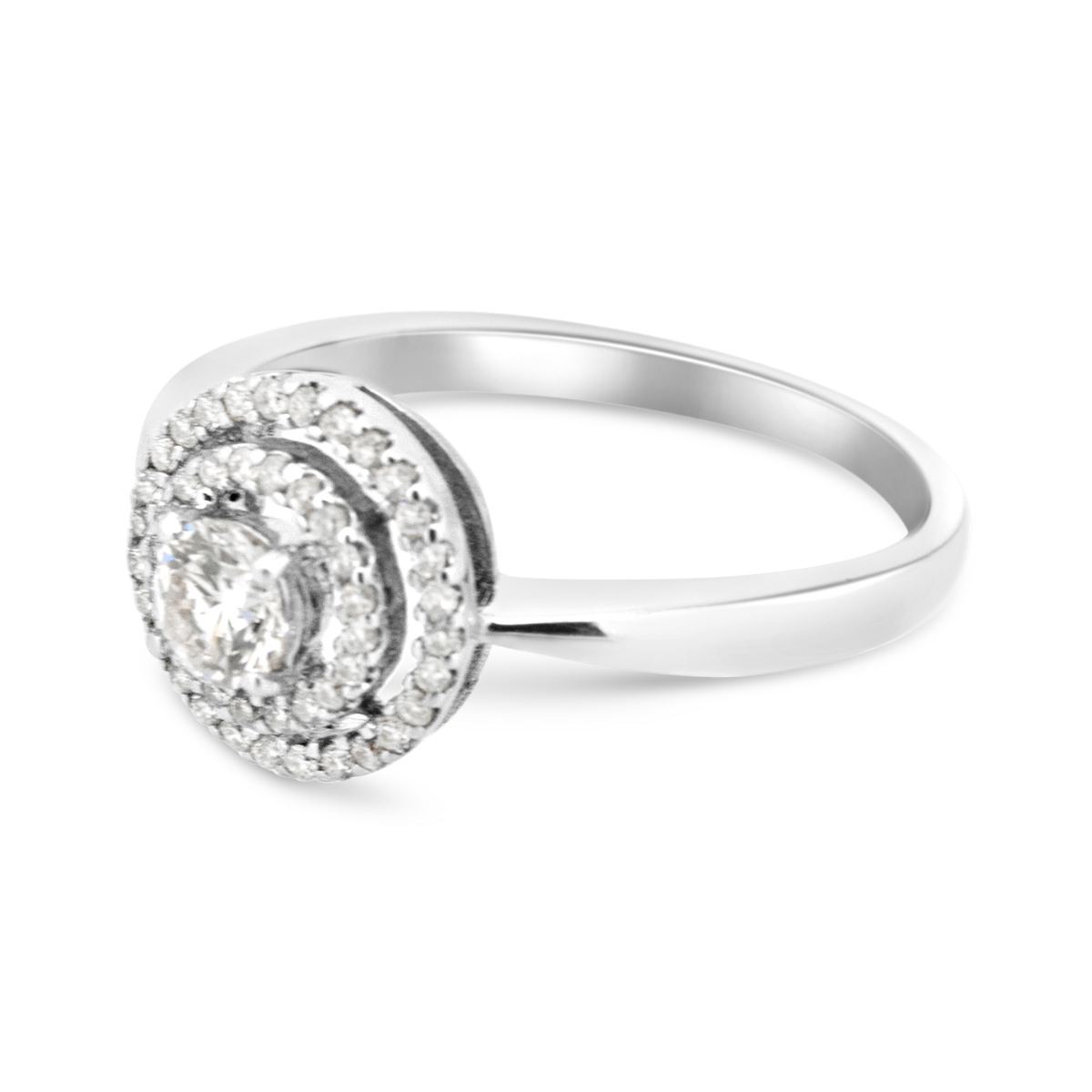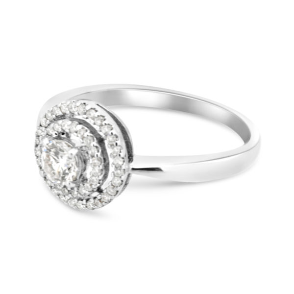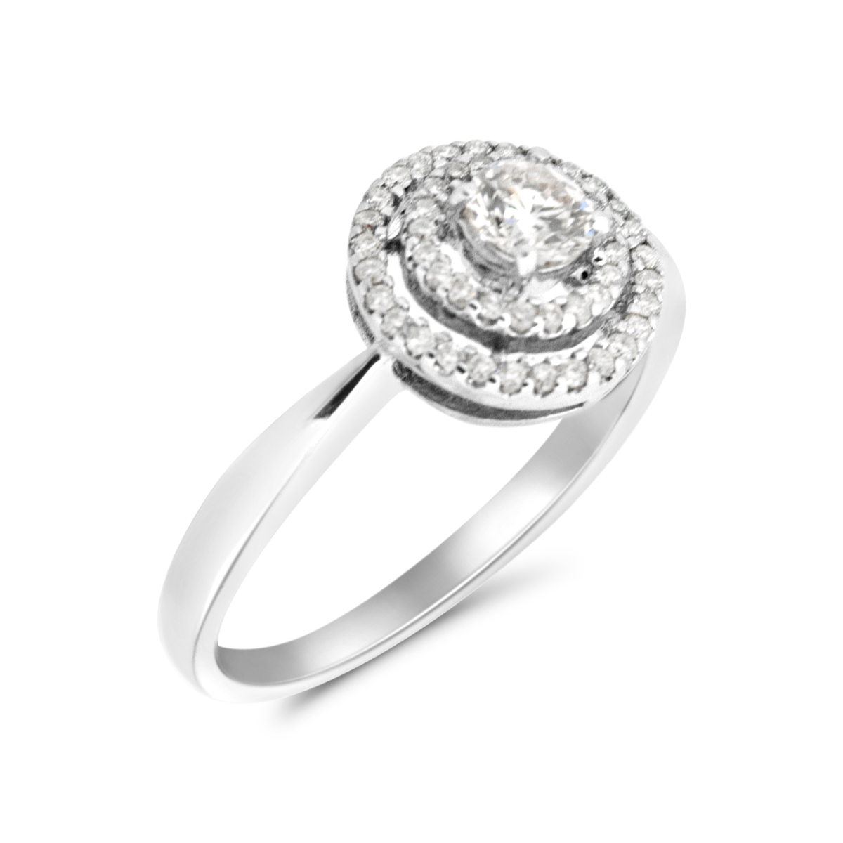 Angellic side halo with cubic zirconia stones on an 18 karat gold ring. Click for the option to set this ring with DIAMONDS