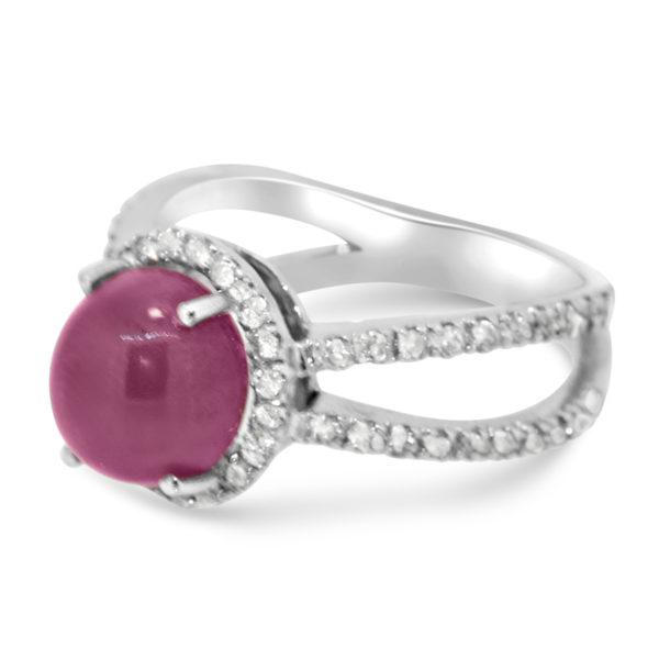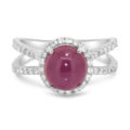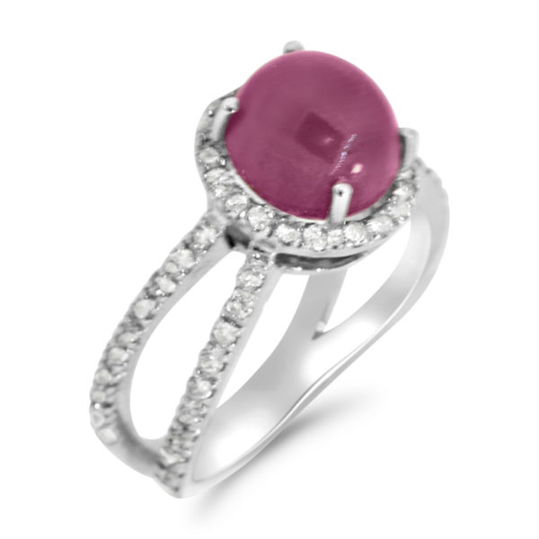 18 KARAT WHITE GOLD DIAMOND RING WITH AN EXQUISITE CABOCHON RUBY
