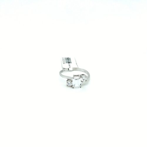 Staggered brilliant cubic zirconia stones on an 18 karat gold ring.