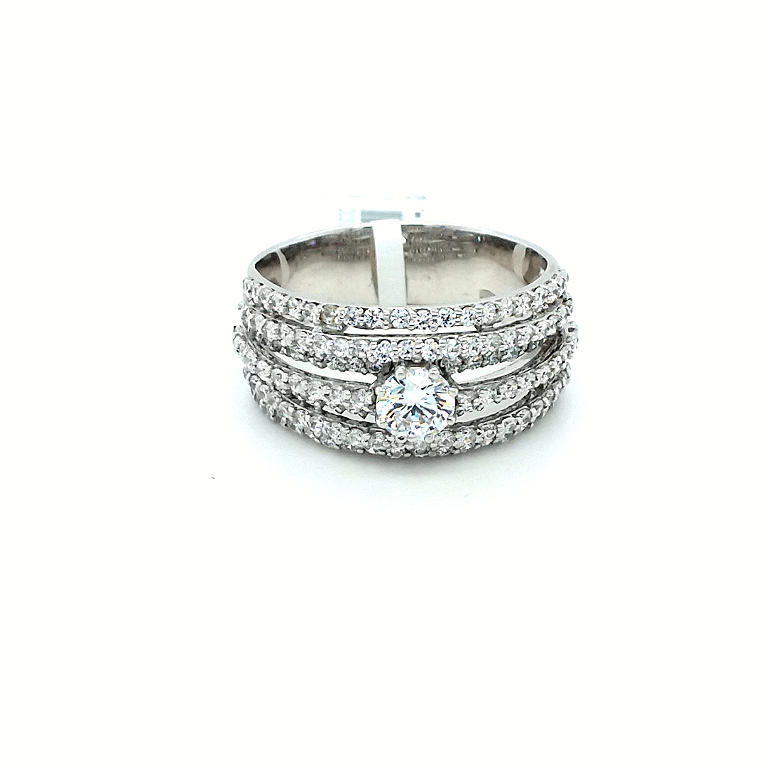 11 layers stationed pave cubic zirconia stones on an 18 karat white gold wide ring.