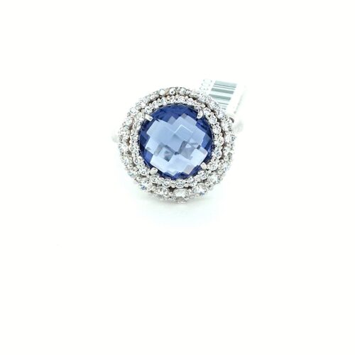 Amethyst dish halo design with cubic zirconia stones on an 18 karat white gold ring.