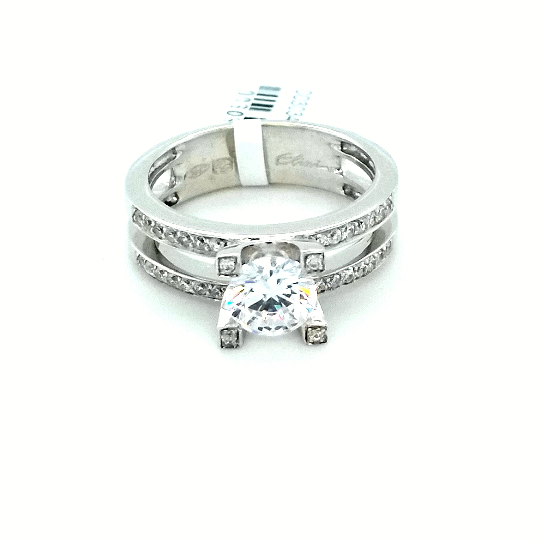 Pave setting diverging fingers cubic zirconia stones on an 18 gold engagement ring.