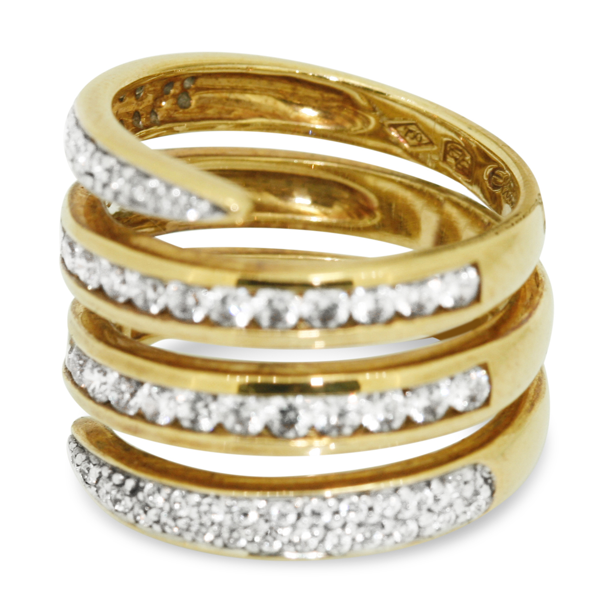 Pave-set with zirconia stones line 4 rows Spiral – with zirconia center stones line an 18 karat yellow spyra ring.