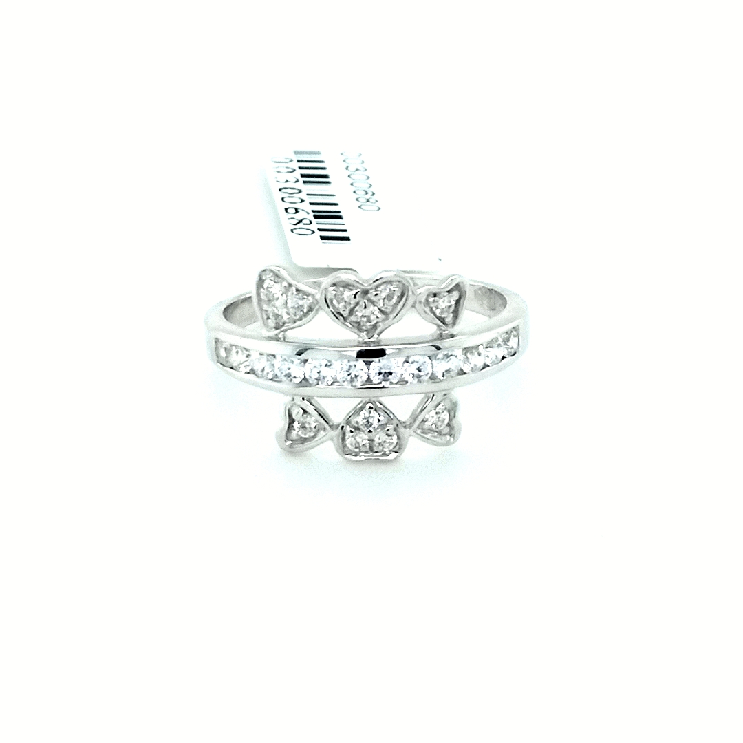 Intertwine 4 row of paved cubic zirconia stones on an 18 karat white gold ring.