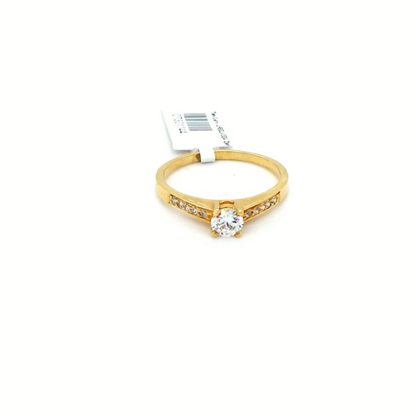 Pave setting diverging fingers cubic zirconia stones on an 18 gold engagement ring.