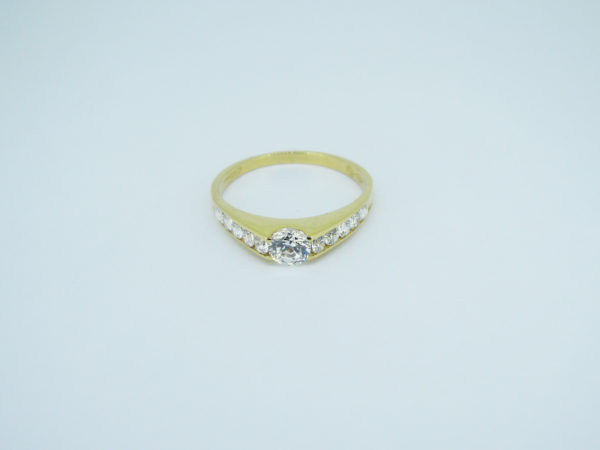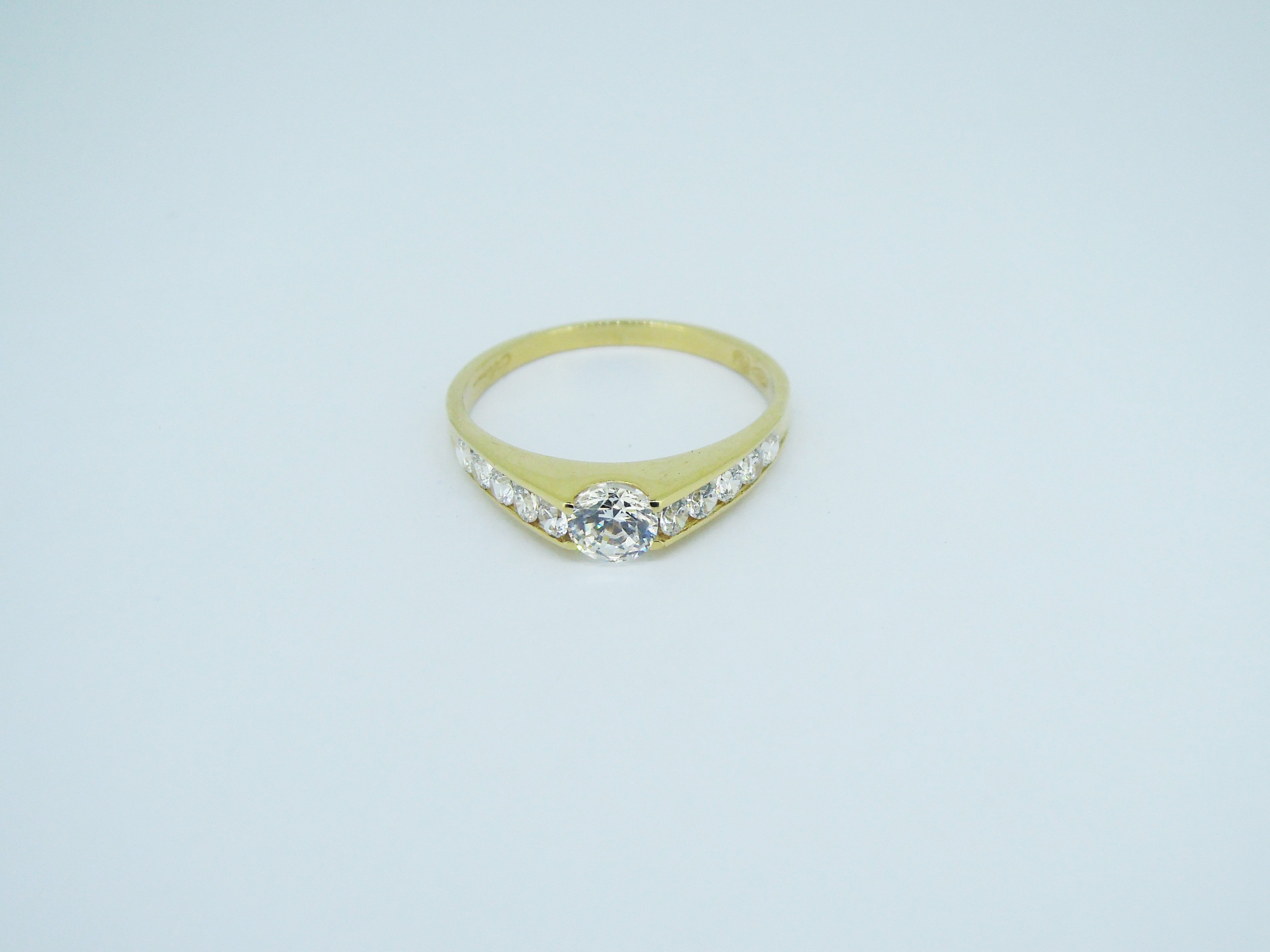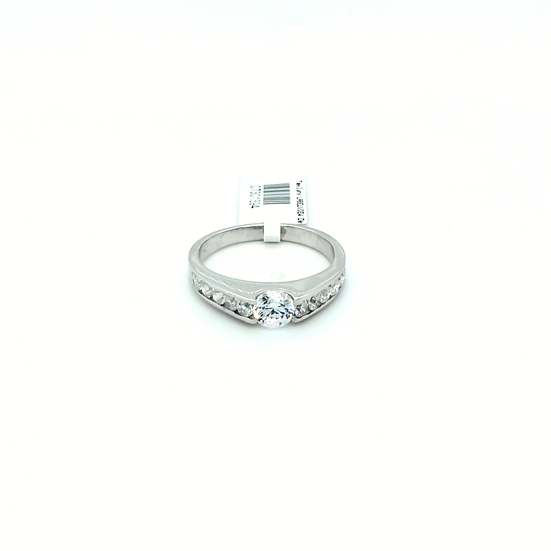 Tension centered round cubic zirconia on a channel setting of cubic zirconia stones on an 18 karat gold ring.